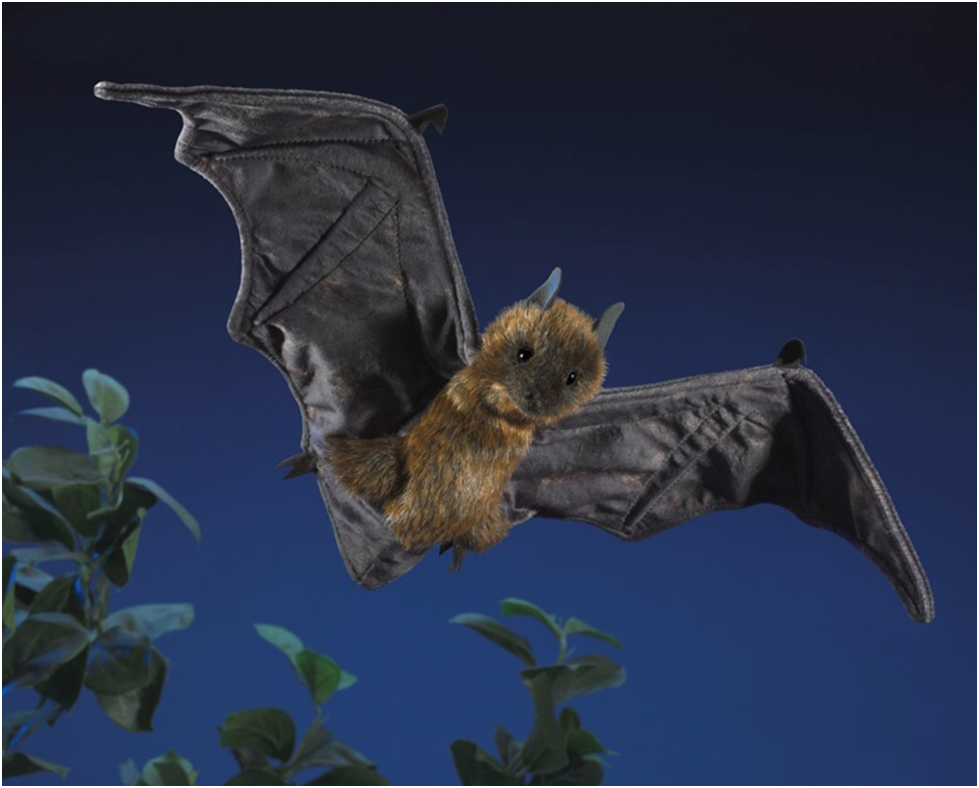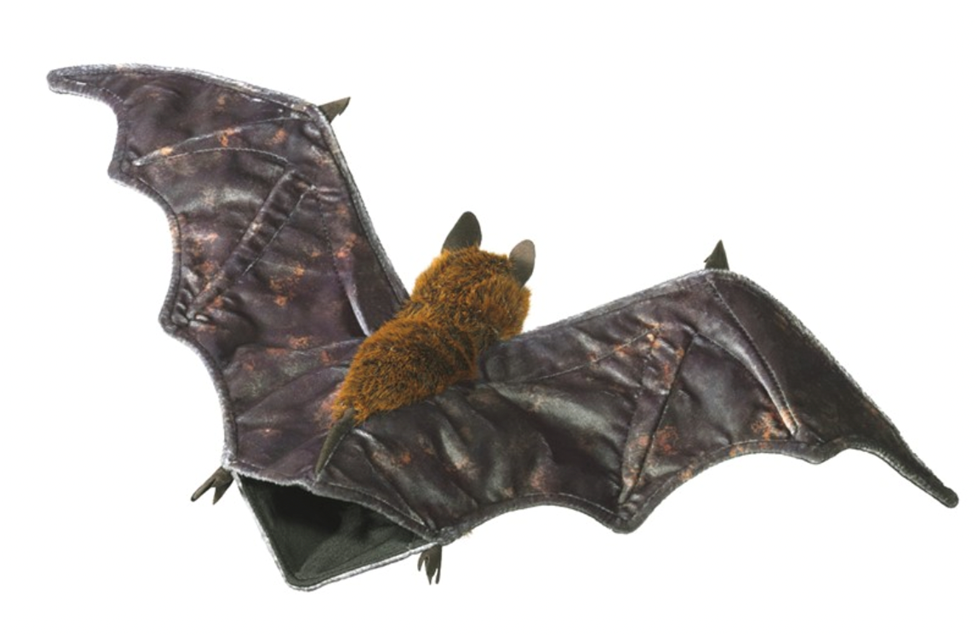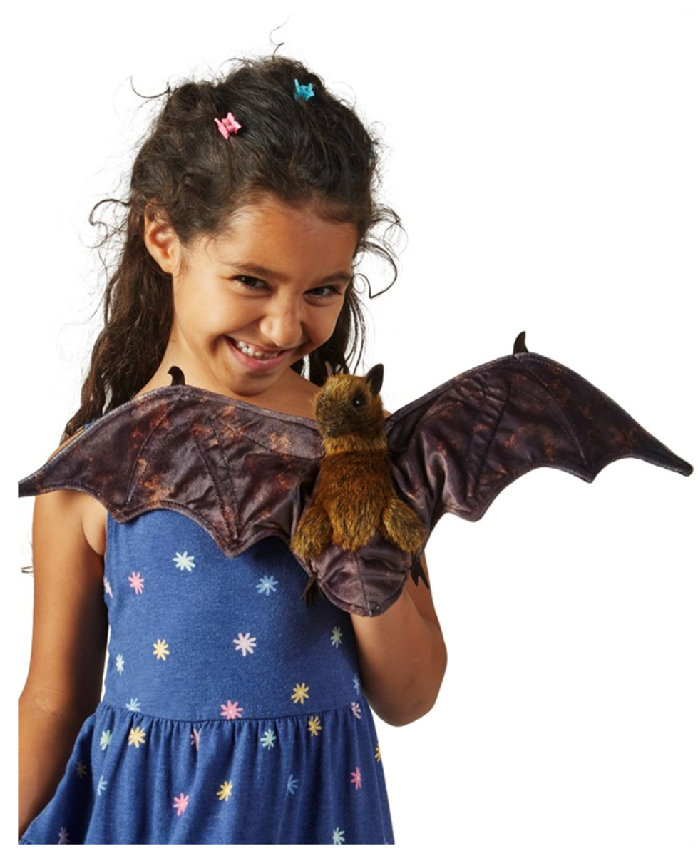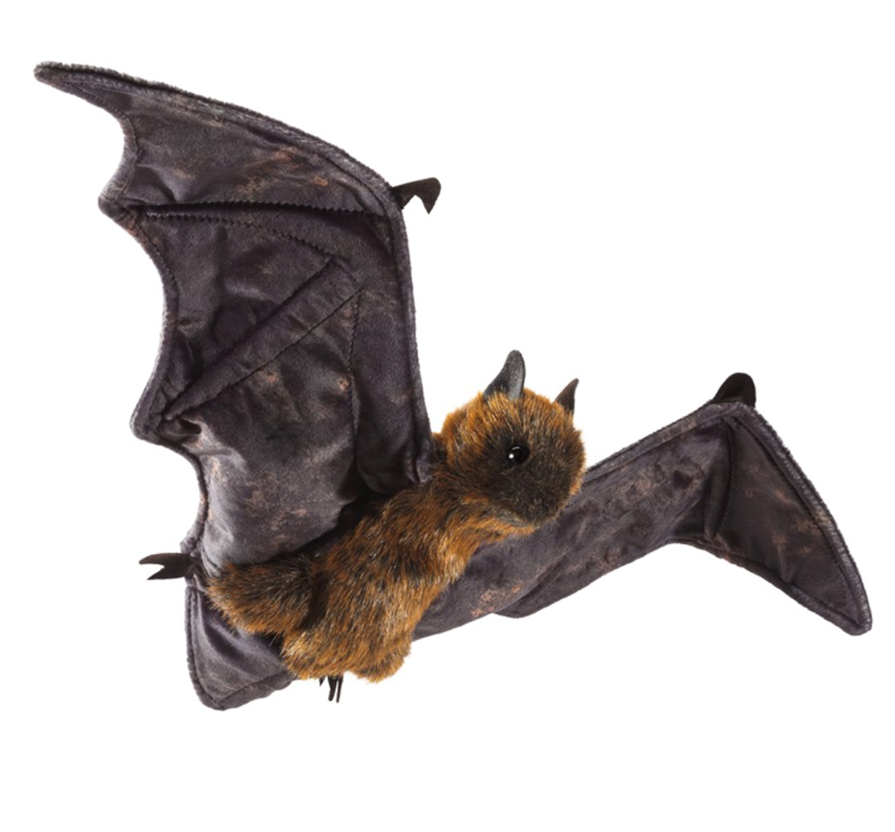 Flying in for friendly fun is the Folkmanis Fruit Bat. Also known as a flying fox, this winged wonder has a cute, foxlike face with short snout and pointy ears as well as movable wings that span 20″ wide.