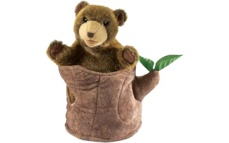 Peeking from his hiding place safe inside a tree stump, this familiar face from the woodlands of North America could charm the honey from the bees. With his soft fur and sweet face, you’ll love animating the BEAR IN TREE STUMP’s mouth and arms to play a game of peek-a-boo!