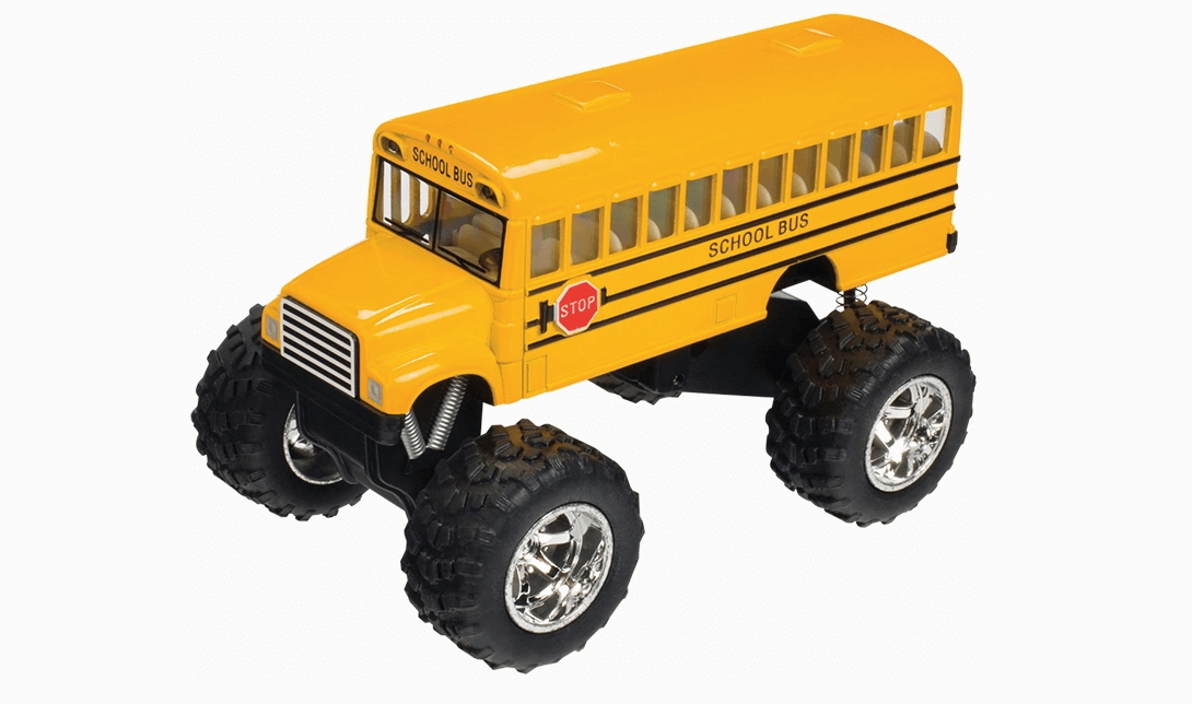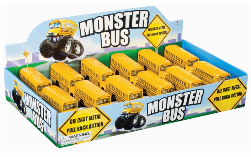 From Rollin’ comes a fun, popular school bus toy with oversized wheels and a monster truck-style design. This sturdy die-cast metal monster school bus toy is 5 inches long and won’t crack, bend, or break, even under intense play. Each bus features bright yellow coloring, SCHOOL BUS lettering on the side, spinning black monster wheels, a red stop sign, and see-through windows. Perfectly sized for small hands. No batteries are required. 12 monster school buses fit neatly inside an illustrated display case. • Age Grade: 5+ • Product Dimensions/Weight: 3.3 L x 5.0 W x 3.3 H / 0.38 lb • Inner Pack Dimensions/Weight: 16.3 L x 16.6 W x 3.6 H / 7.5 lb • Made In: China • Batteries not required