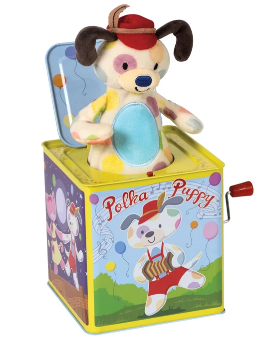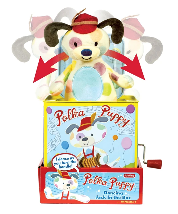 - A classic Schylling Jack in the box with a unique difference, the Polka Puppy dances as the handle is turned